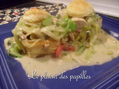 Entretemps, chauffer le four à 350°F. Mettre les feuilletés de vol au vent sur une plaque à biscuits et les faire dorer 10-12 minutes. Enlever les capuchons et verser la garniture de légumes et poulet dans les vols au vent et remettre le capuchon sur le dessus et servir :)